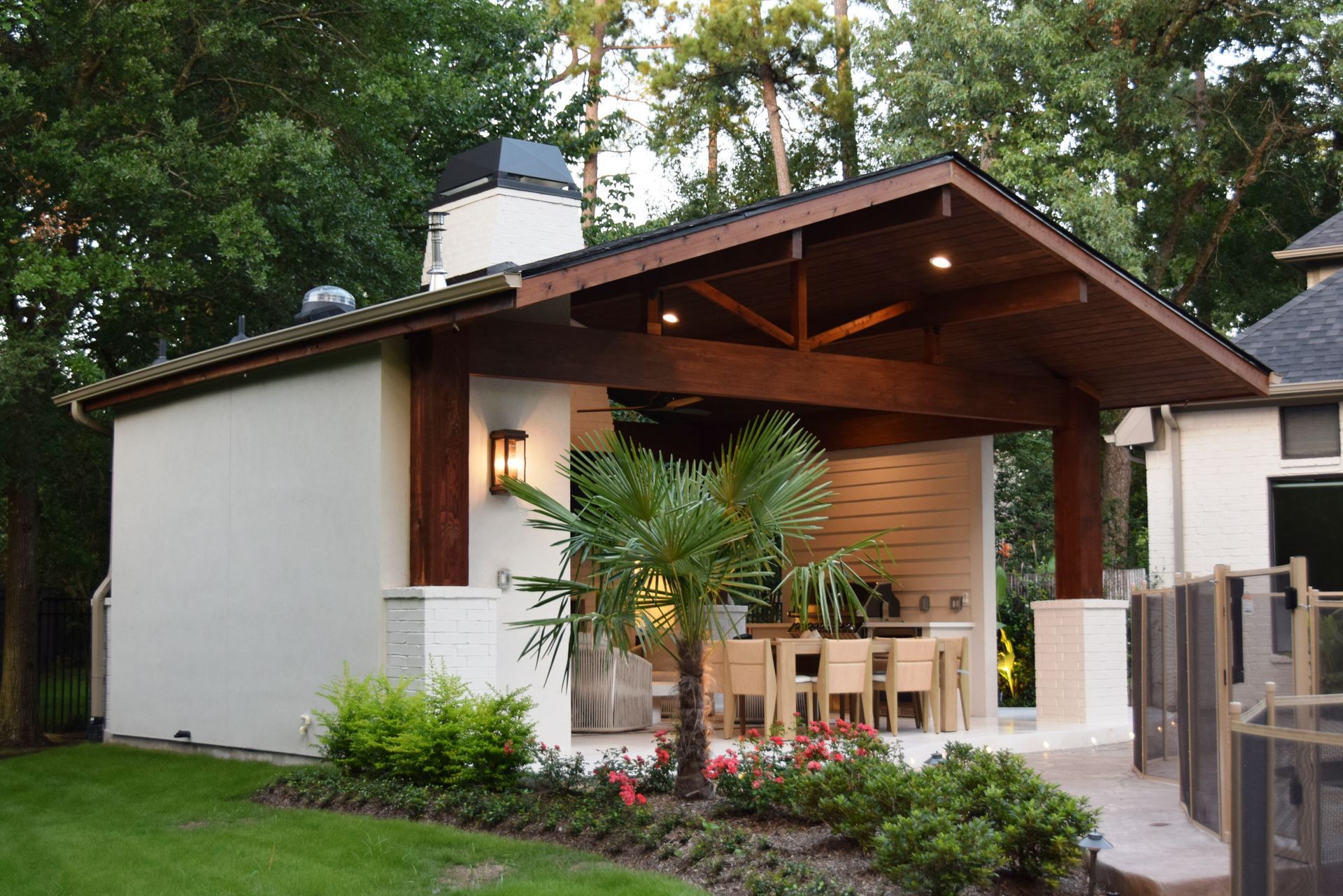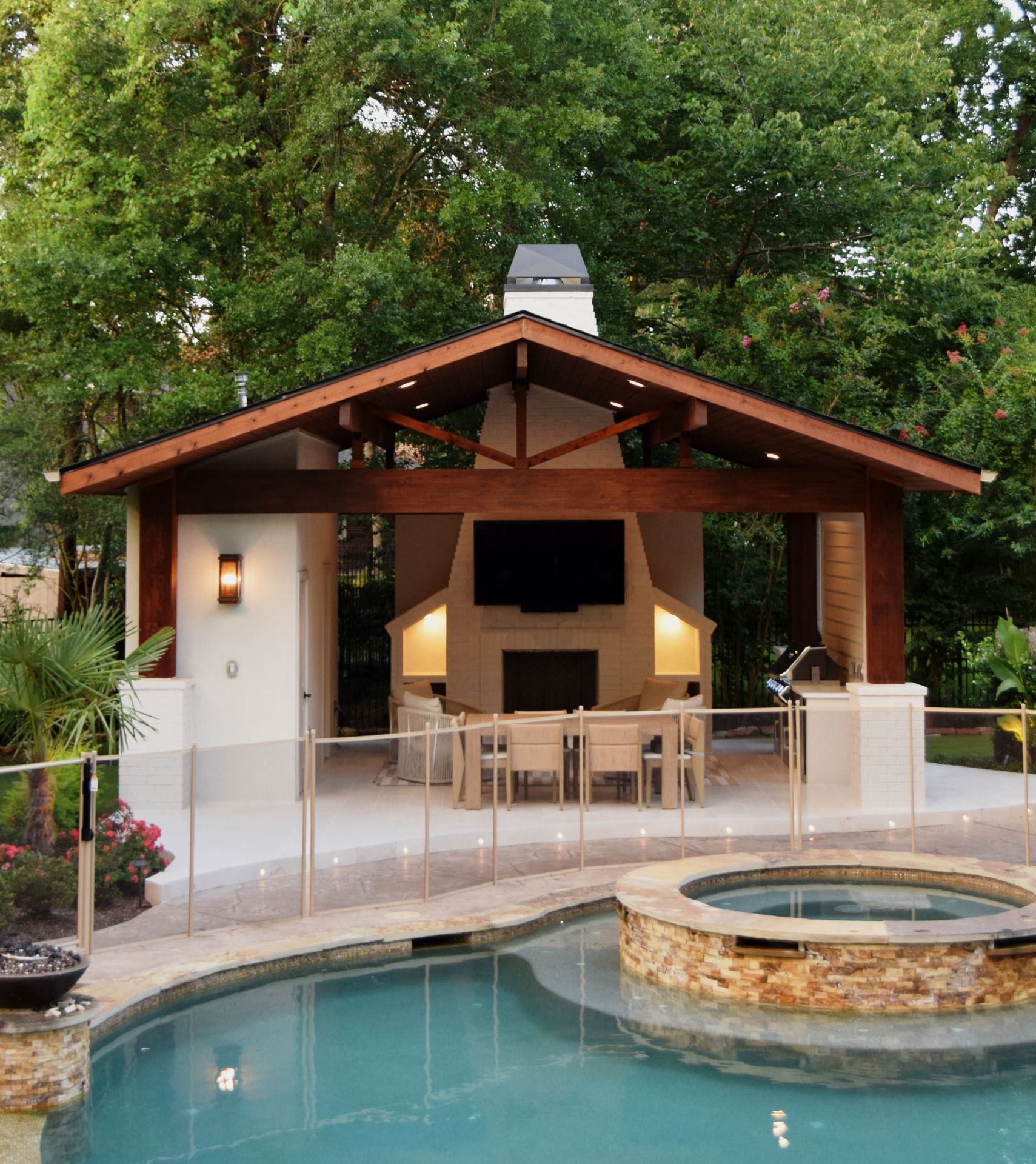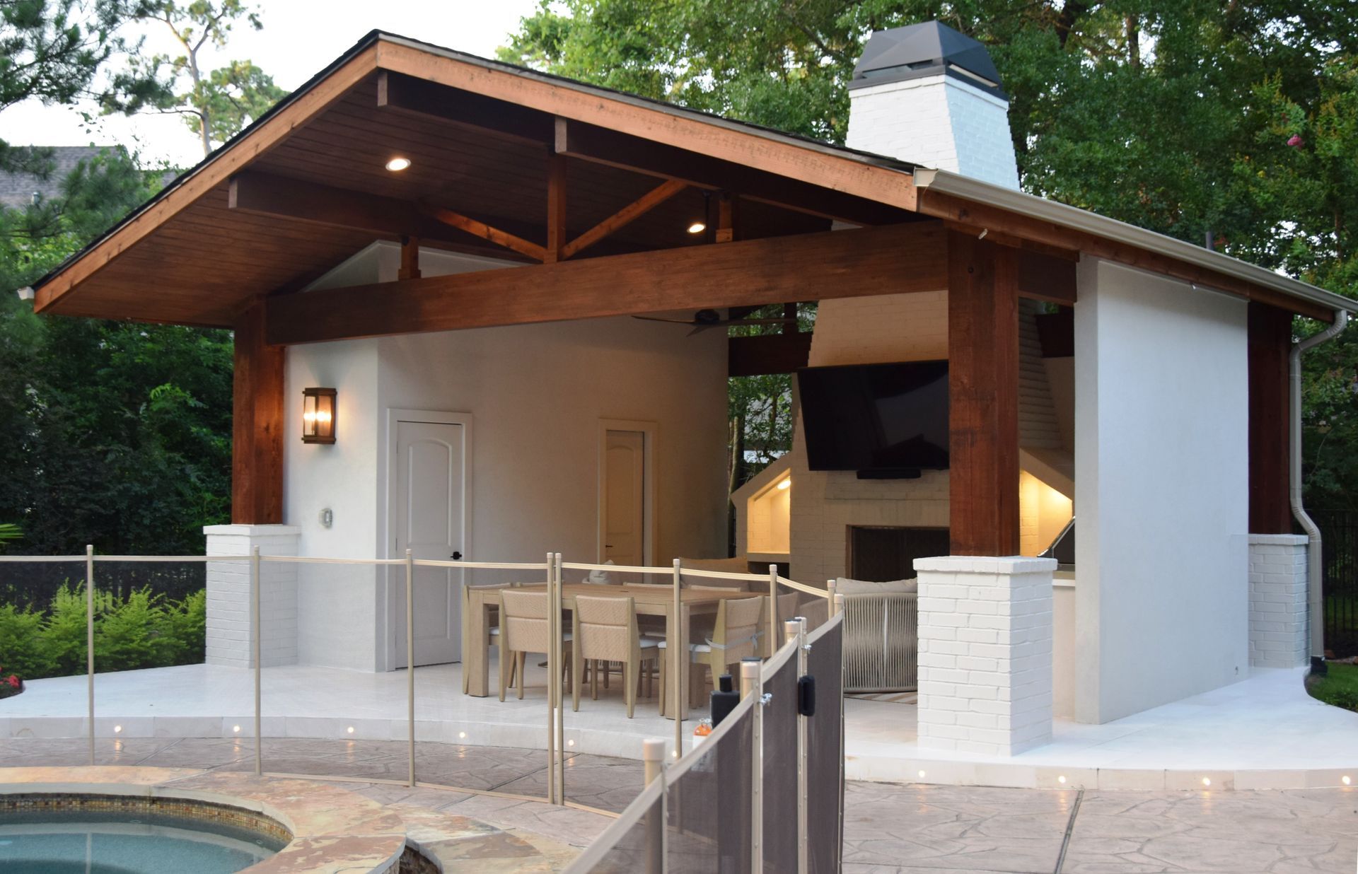 A standout feature of the project was the addition of a 600 SF pool house, designed to complement the natural surroundings while integrating modern utility. Constructed with striking 12x12 cedar columns, exposed stain-grade structural beams, and a matching stain-grade ceiling, the pool house also includes a full bath. To preserve the landscape's visual integrity, a required underground water detention system was installed. The entire property is supported by a 40kW whole-home generator for added resilience and comfort.