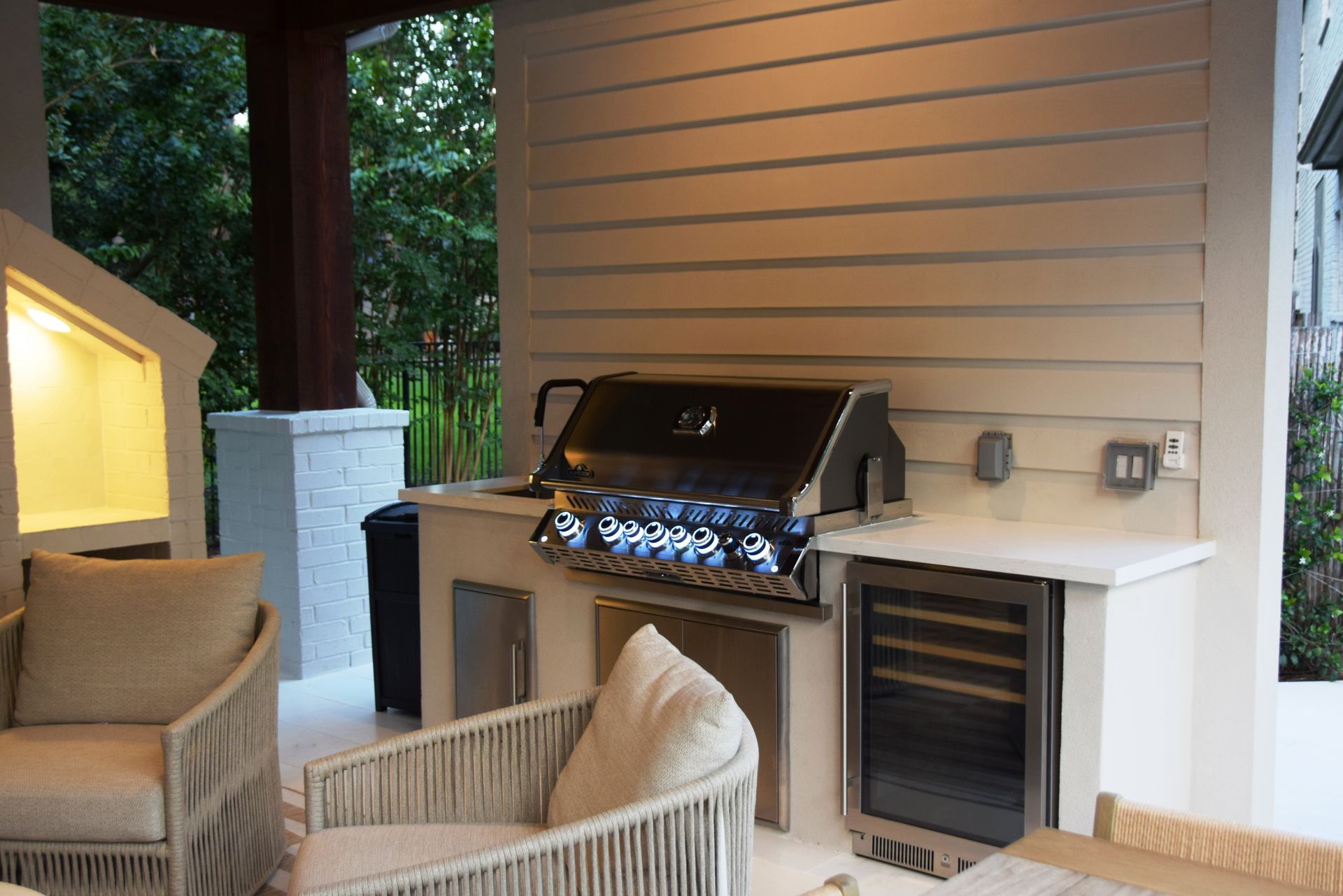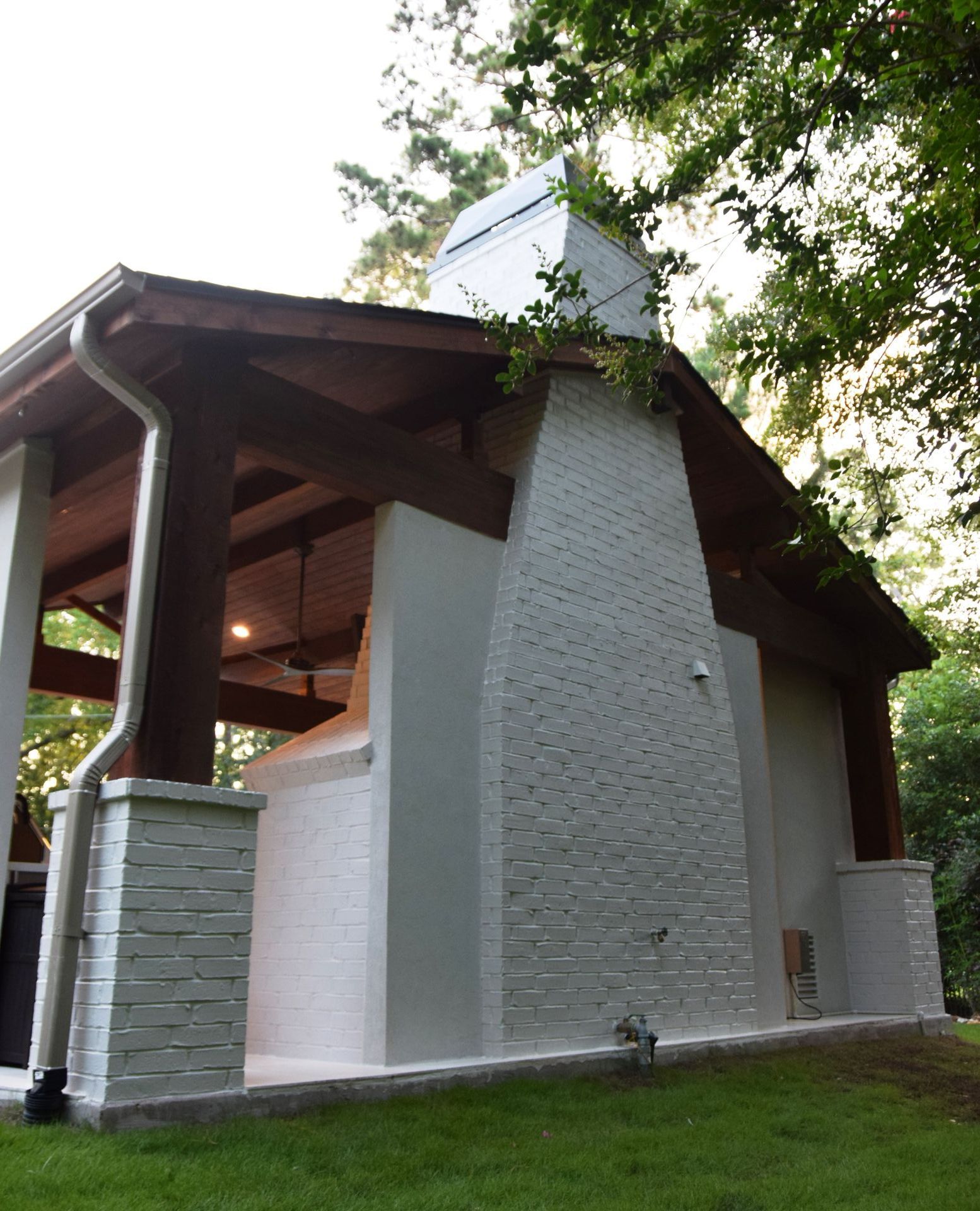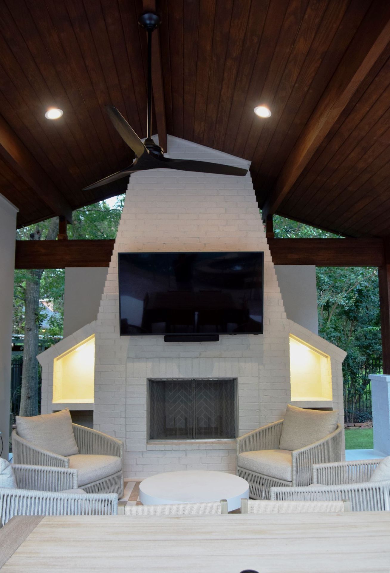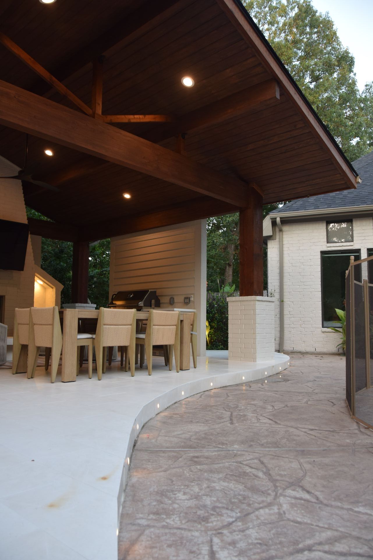 A standout feature of the project was the addition of a 600 SF pool house, designed to complement the natural surroundings while integrating modern utility. Constructed with striking 12x12 cedar columns, exposed stain-grade structural beams, and a matching stain-grade ceiling, the pool house also includes a full bath. To preserve the landscape's visual integrity, a required underground water detention system was installed. The entire property is supported by a 40kW whole-home generator for added resilience and comfort.